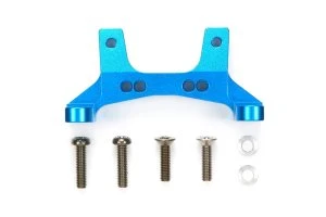 This blue-anodized aluminum rear damper stay mount offers increased damper attachment rigidity for optimum damper effect. It has 2 different upper arm attachment positions to allow fine setting adjustments.