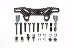 This carbon fiber damper stay design is for your TT-02 chassis car, which is compatible with the front and rear. It measures 3.5mm and is a half millimeter thicker than previous carbon fiber shock towers. (items 54639 and 54640)